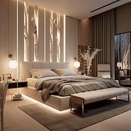 • Акцентный свет – LED-лента за изголовьем, подсветка текстурных стен.